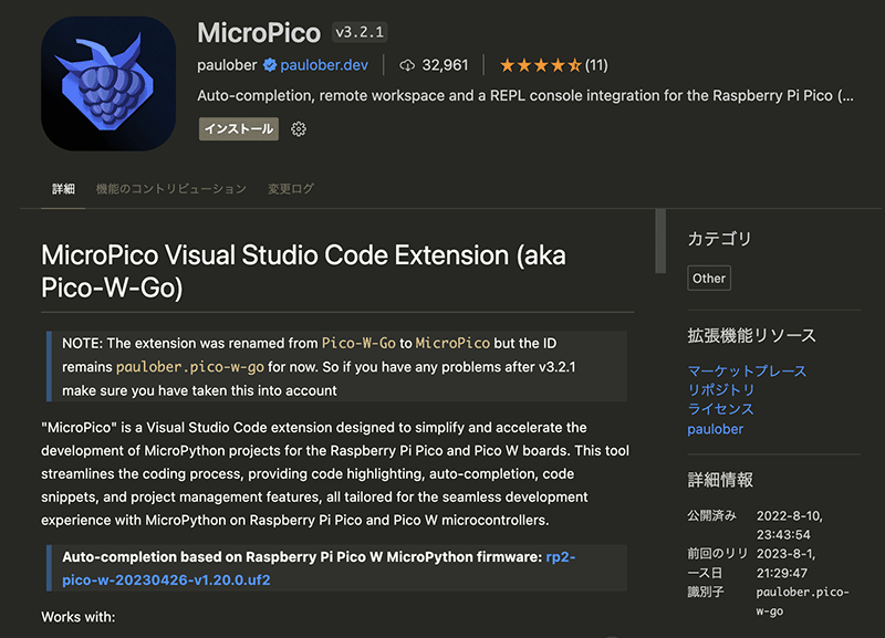 上記の「MicroPico」ですが、当初「Pico-Go」として公開され、その後「Pico-W-Go」となり、現在は「MicroPico」(2023年8月現在)となったようです。この記事を書いた当初は「Pico-Go」について紹介していましたが、「Pico-Go」や「Pico-W-Go」が共にメンテされなくなったため記事を更新しました。この機能拡張は、初代「Pico」でも、その後発売された「Pico W」でも問題なく動作します。