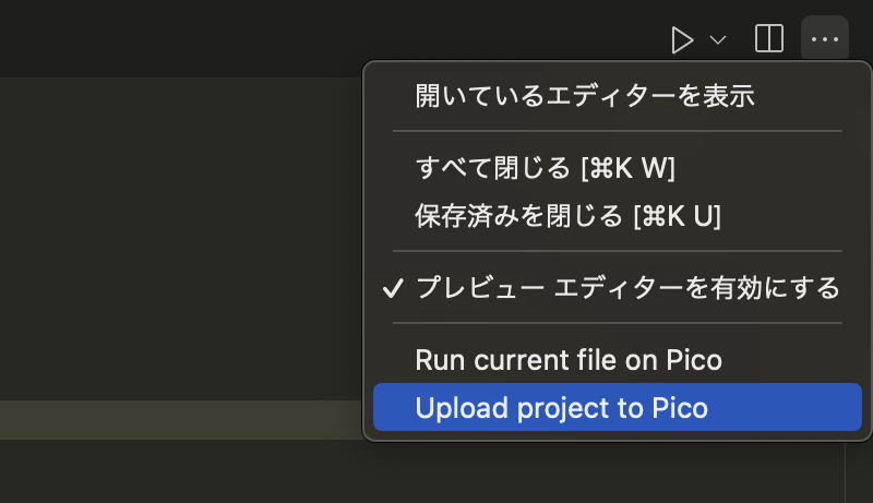書いたコードをひとまず実行したい場合ですが、ウィンドウ右上の「…(三点リーダー)」から「Run current file on Pico」を選択することで実行されます。あるいは、ターミナルウィンドウ左下の「▷ Run」でも実行されます。