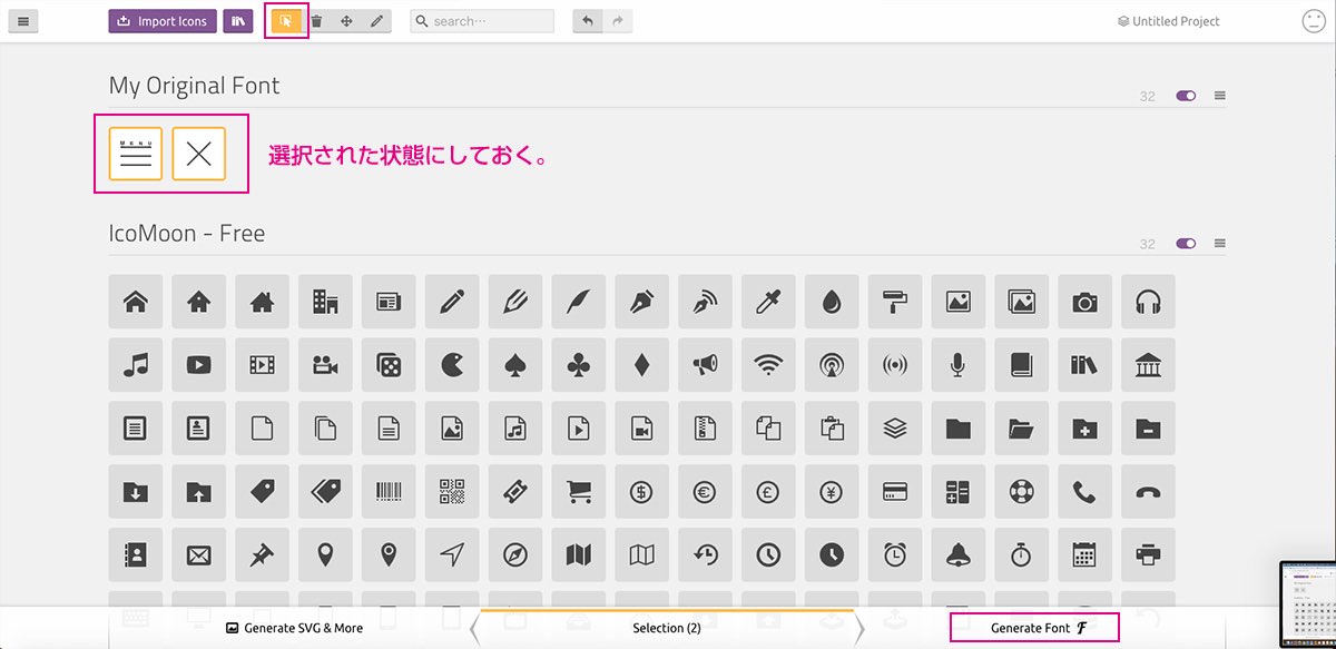 今度は使用するアイコンを選択します。当然、自分でアップしたものは選択しておきましょう。もしIcoMoonのフリーフォントもオリジナルのfontファイルに組み込みたい場合は、一緒に選択しておくこともできます。