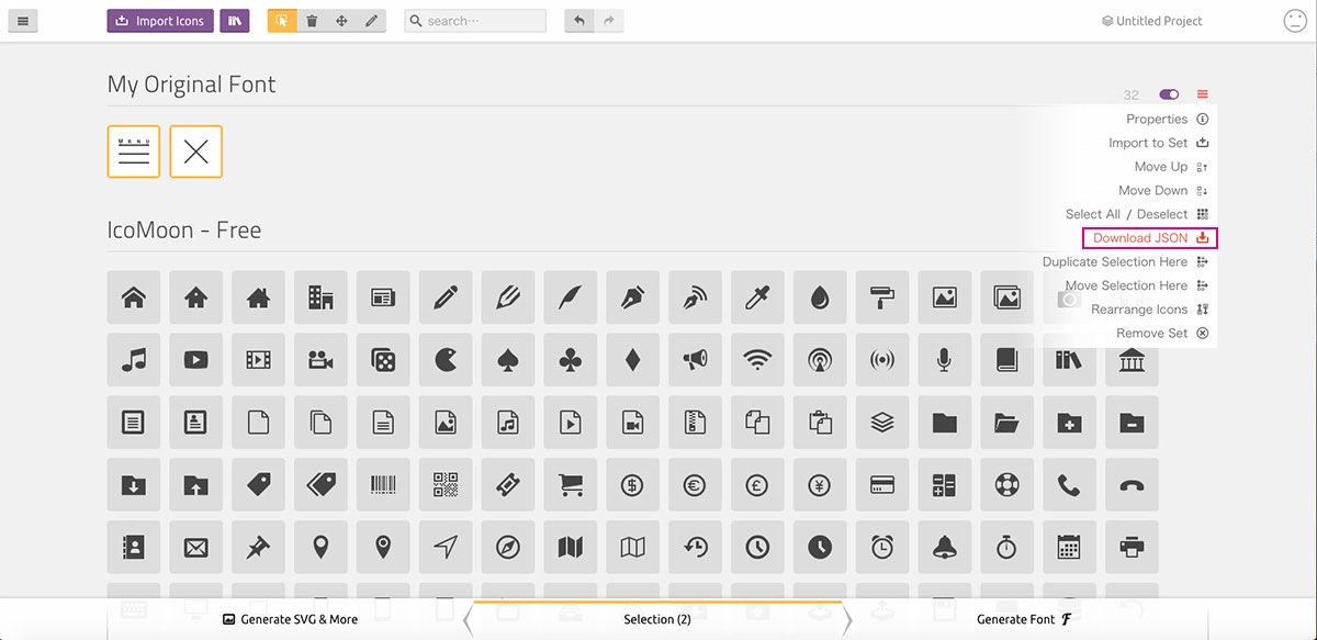 しかし、継続してIcoMoonのApp機能を利用したり、複数端末で管理したりするような場合は、プロジェクトが消えてしまうのでたいへん不便です。そんな時のために、アップロードしたオリジナルのアイコンフォントはjsonとして保存しておきましょう。